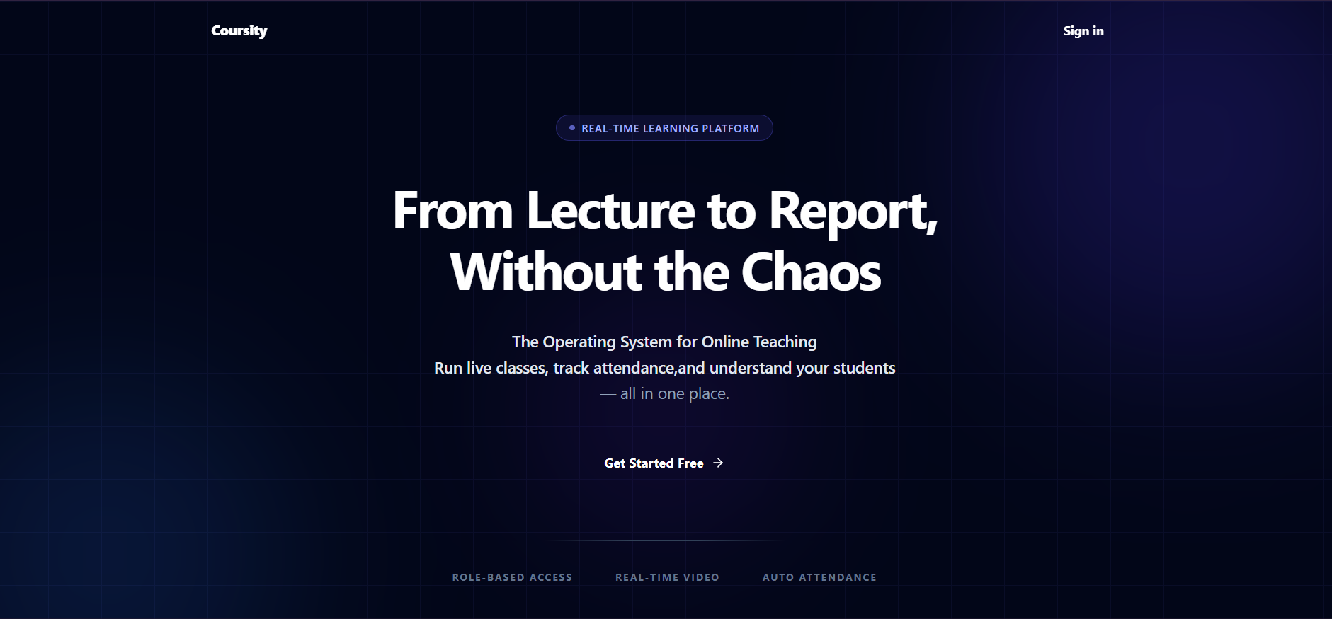 A full-stack live course platform with video streaming, chat, attendance tracking, and role-based access for teachers and students.